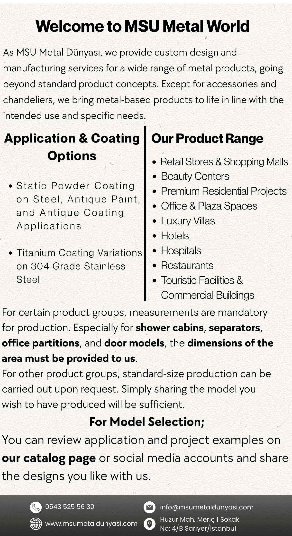 MSU Metal Dünyası, metal sektöründe kalite, güven ve yenilikçilik ilkeleriyle, Avrupa Kalite Standartlarına uygun CE ve ISO 9001 belgeleriyle faaliyet gösteren bir firmadır.