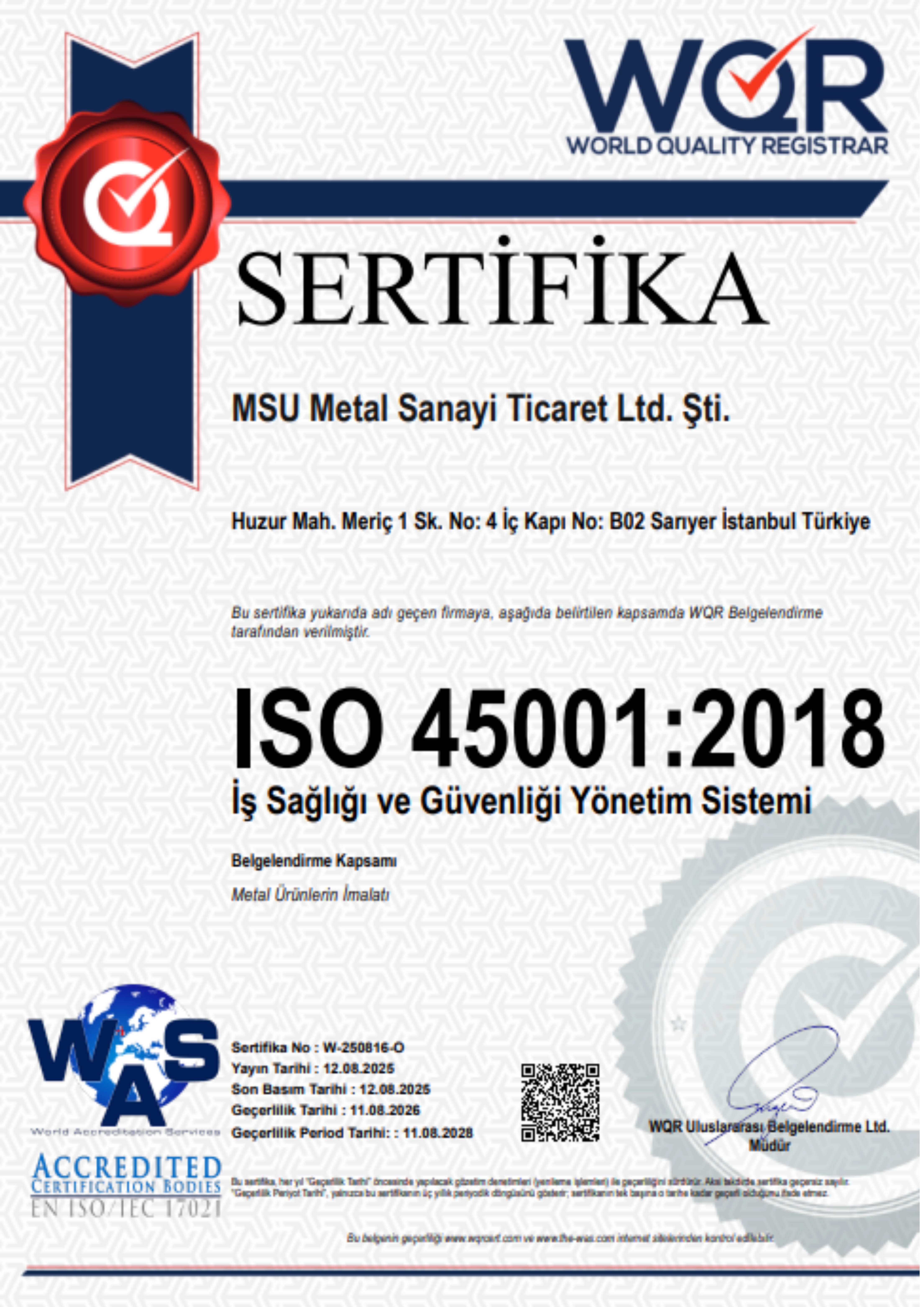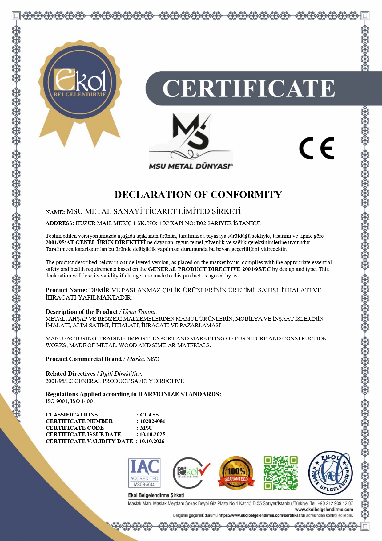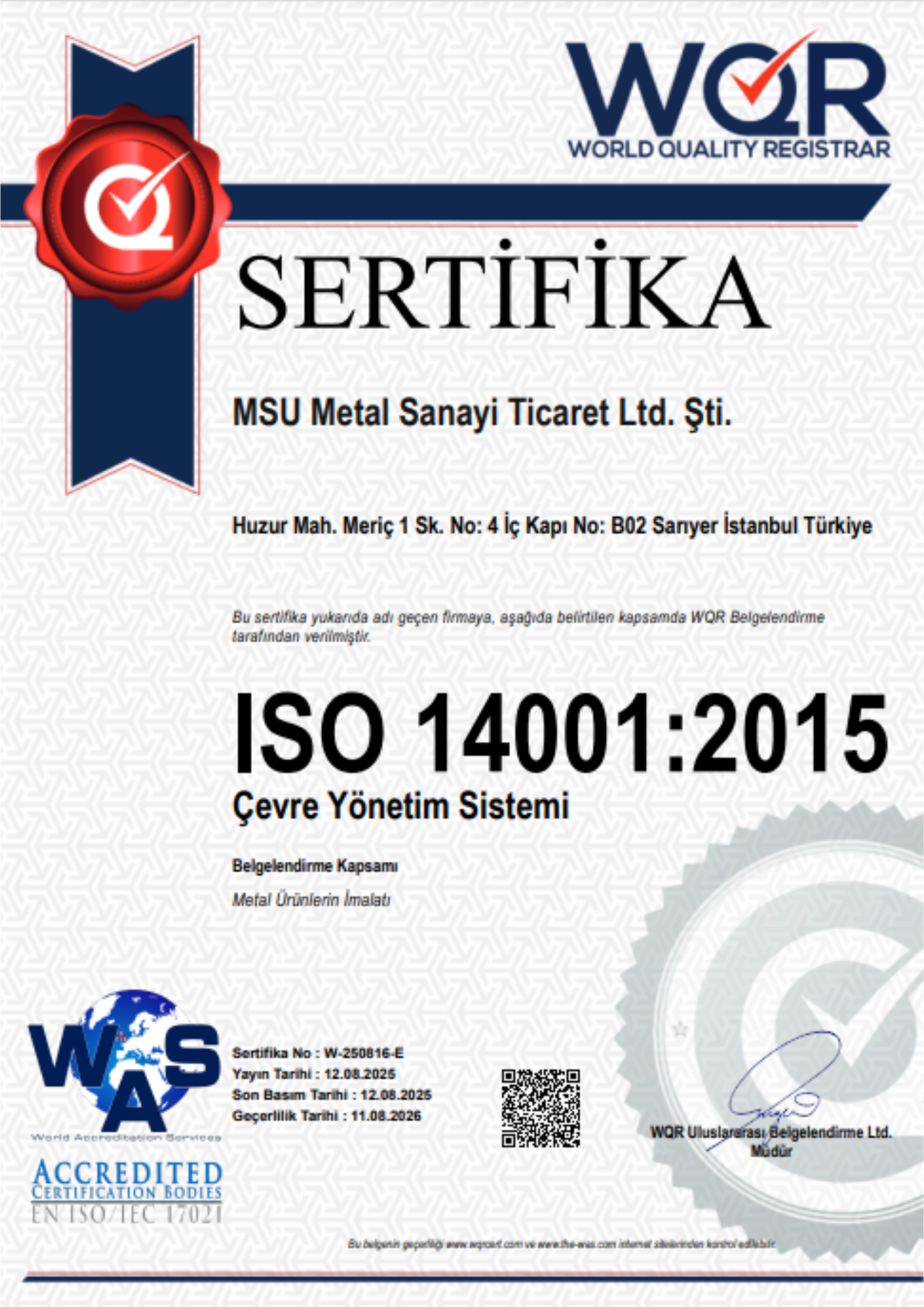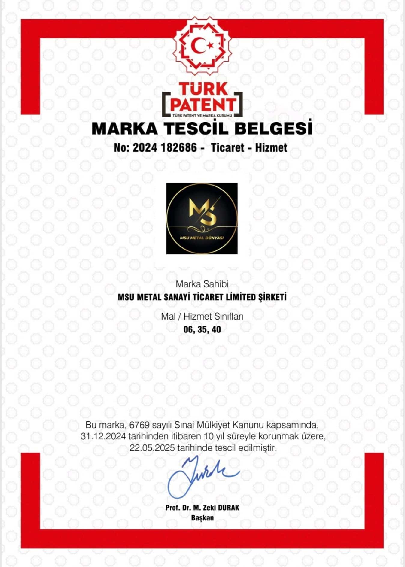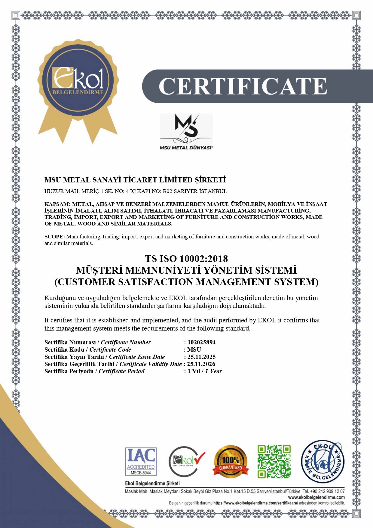 MSU Metal Dünyası markasının sahip olduğu kalite sertifikaları ve belgeler